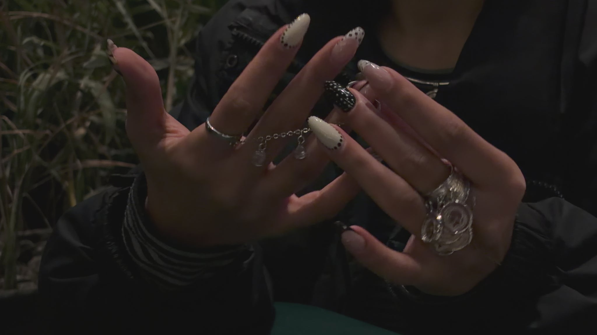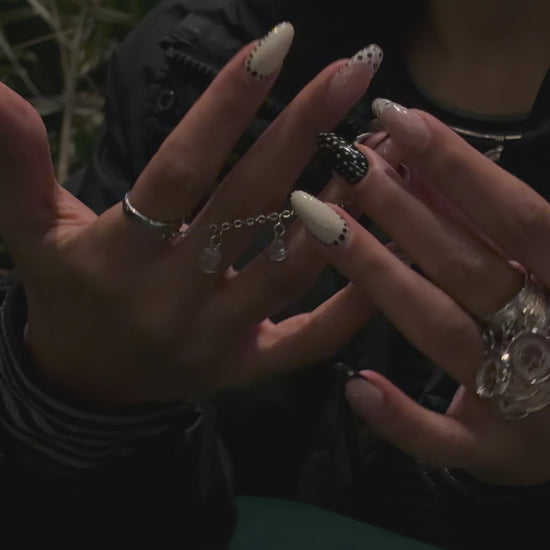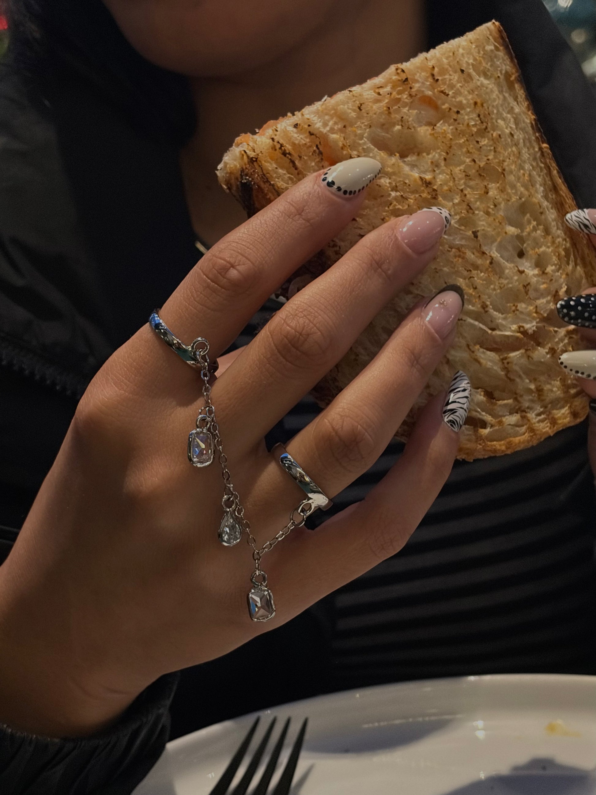 It consists of two separate rings with a crystal adorned chain in between.